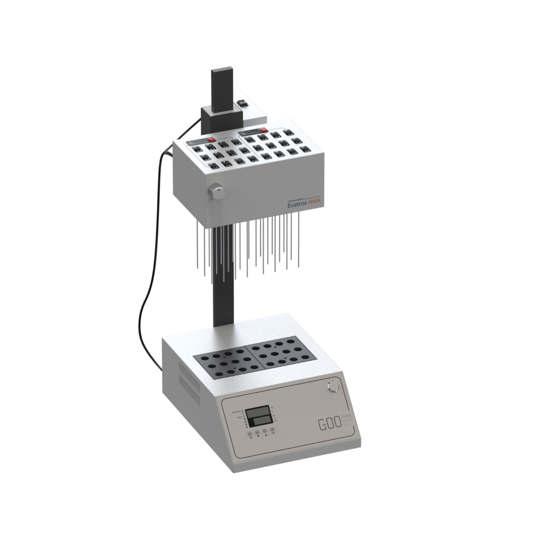 Evatros mini, davlumbaz içine monte edilebilen gaz üflemeli bir solvent buharlaştırıcıdır. 24 adede kadar numune konsantre edilebilir ve her 24 nozul, açma/kapama düğmesi aracılığıyla bağımsız olarak kullanılabilir. Hız kontrolörü ayrıca genel gaz akış hızını da kontrol eder.